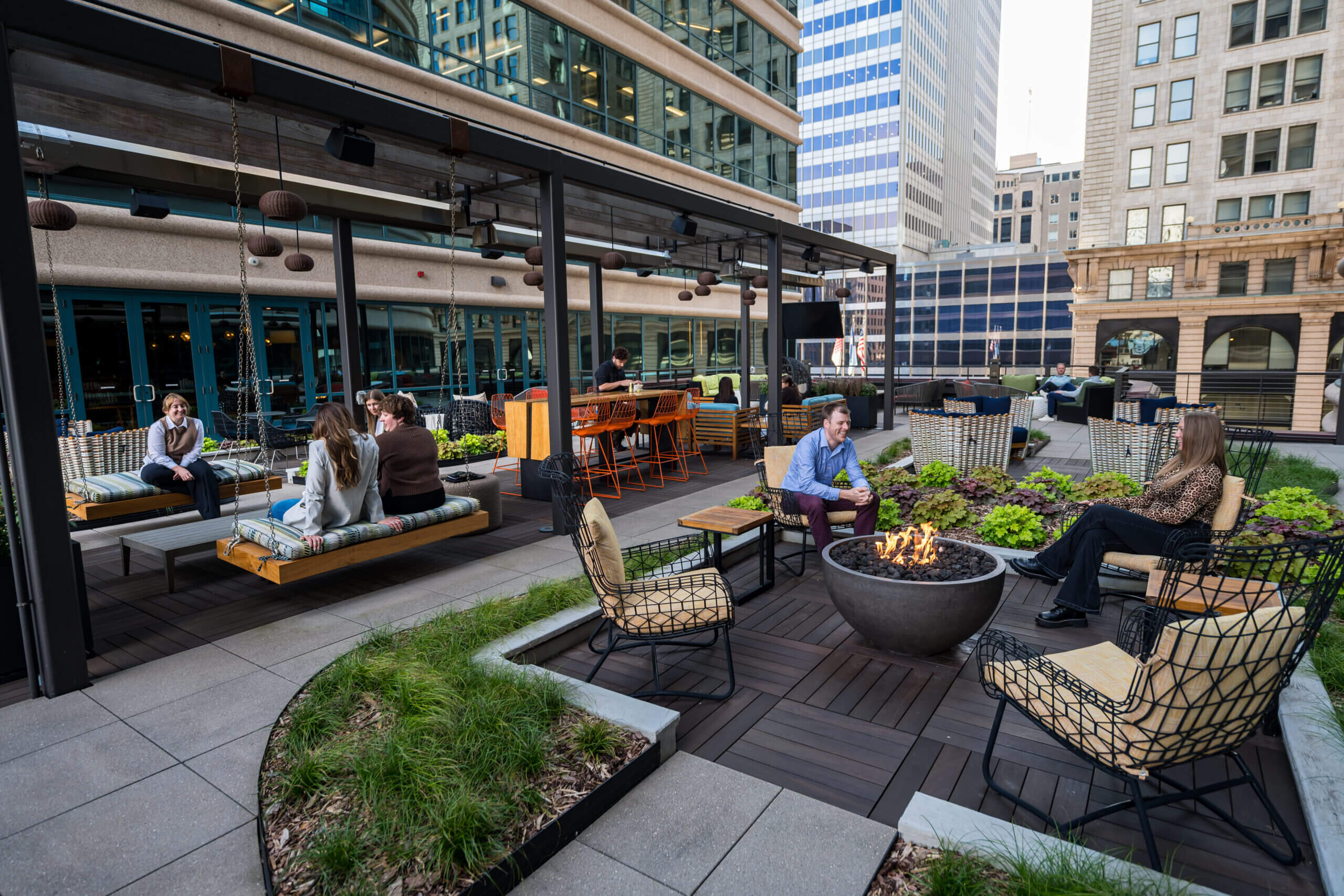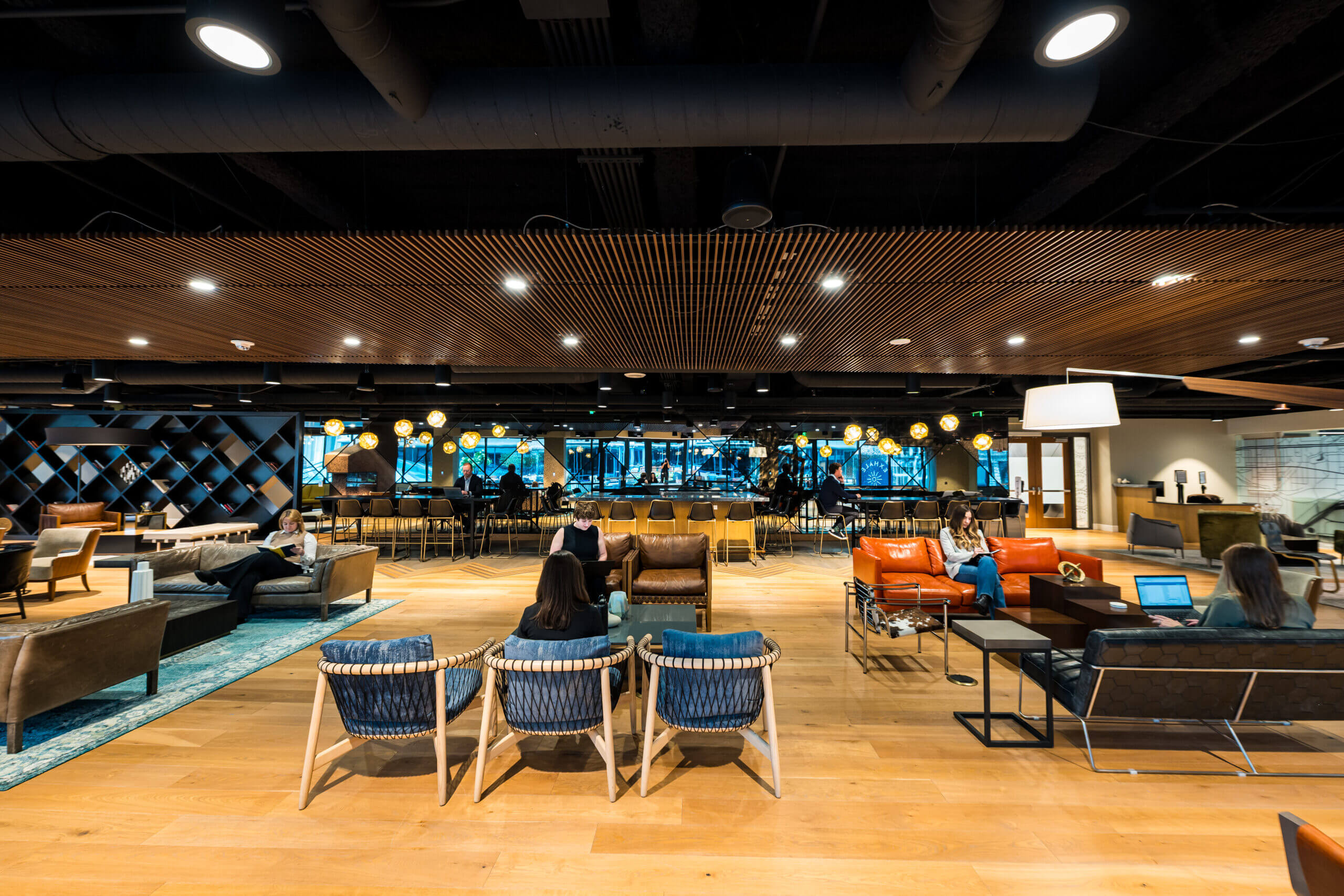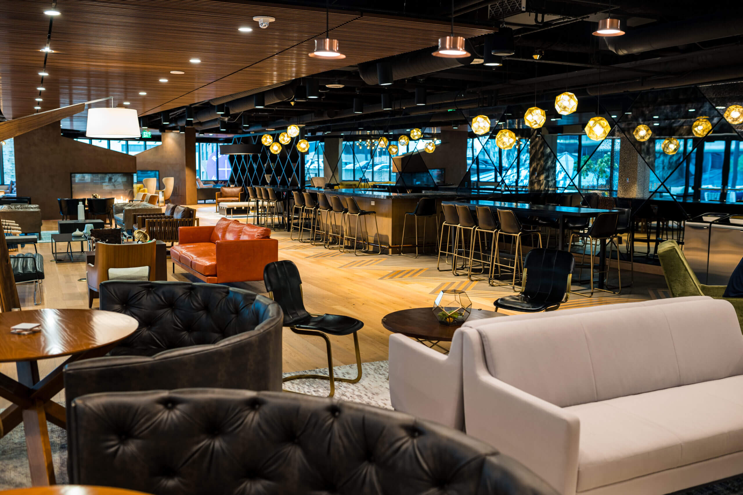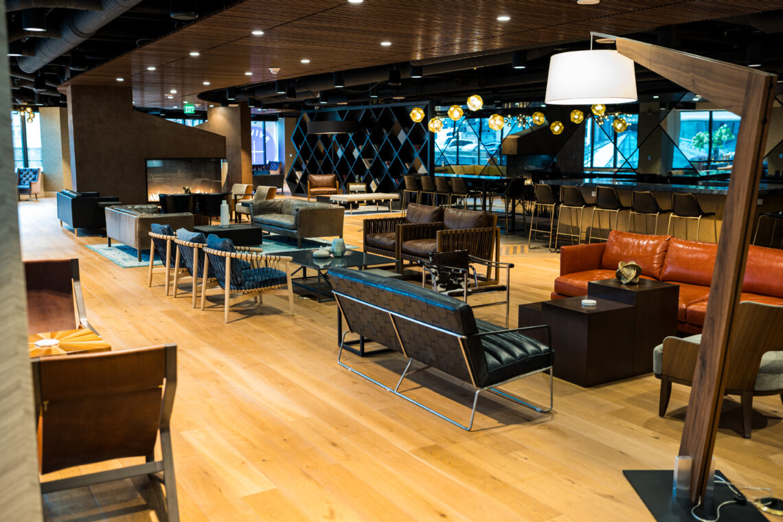 Connect lounge is a welcoming spot for employees looking for a change of scenery, featuring bar and lounge seating, private nooks, and cozy fireplaces.
