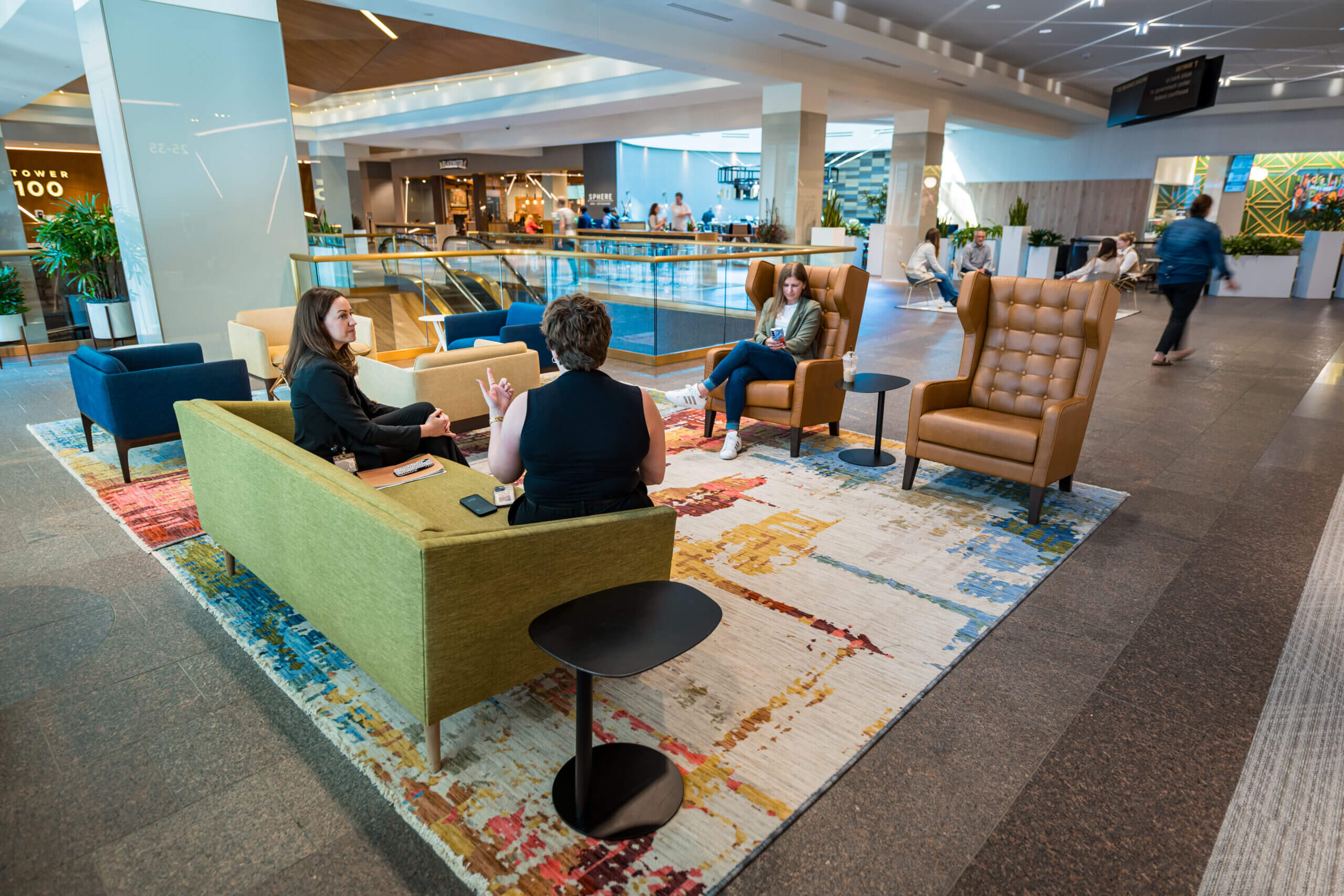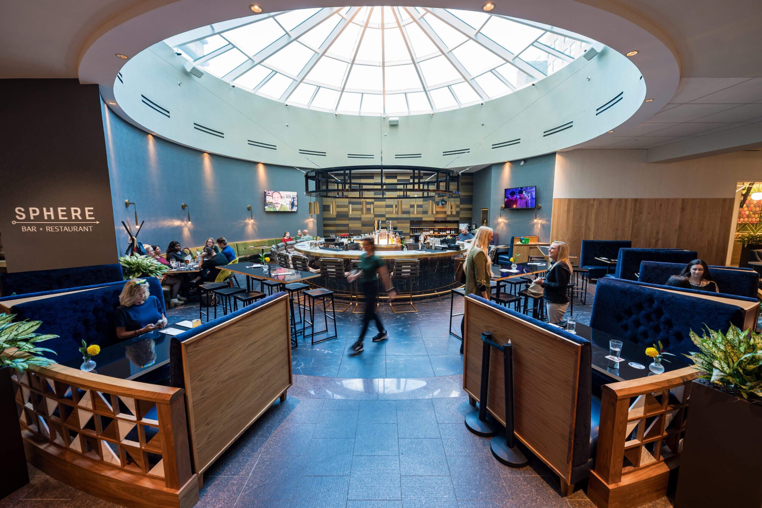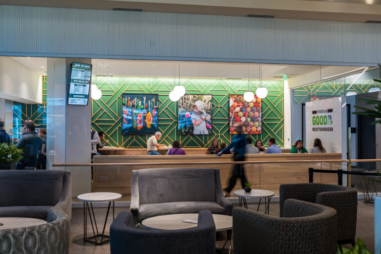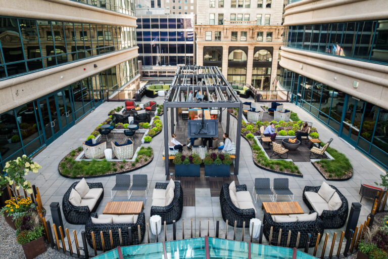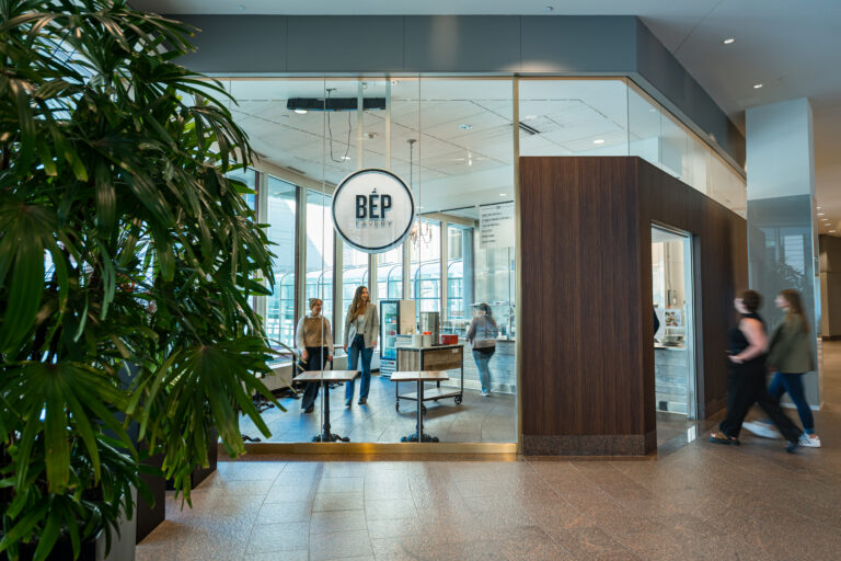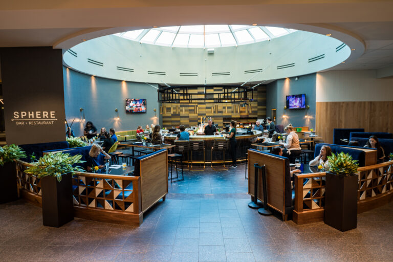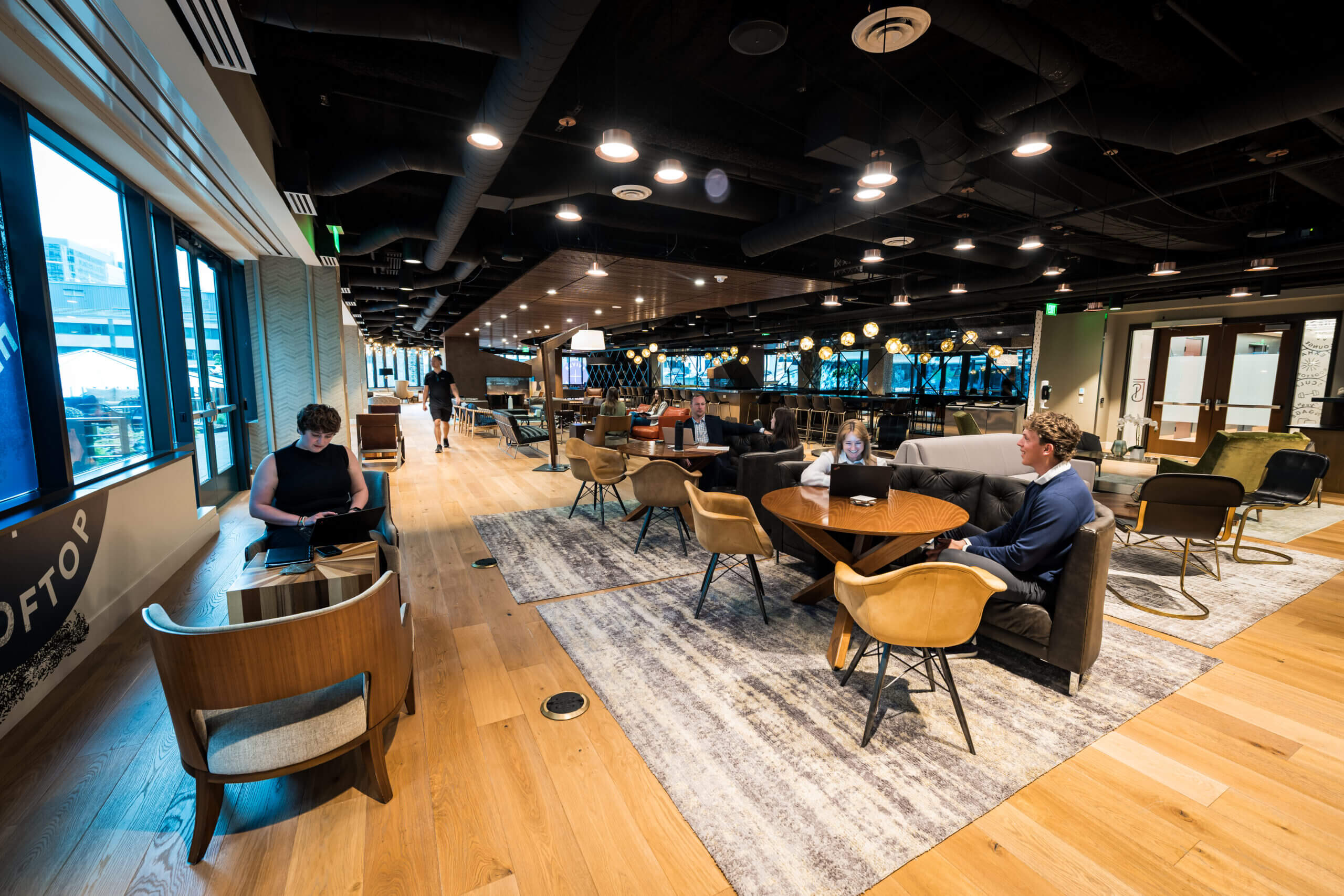 Connect lounge is a welcoming spot for employees looking for a change of scenery, featuring bar and lounge seating, private nooks, and cozy fireplaces.