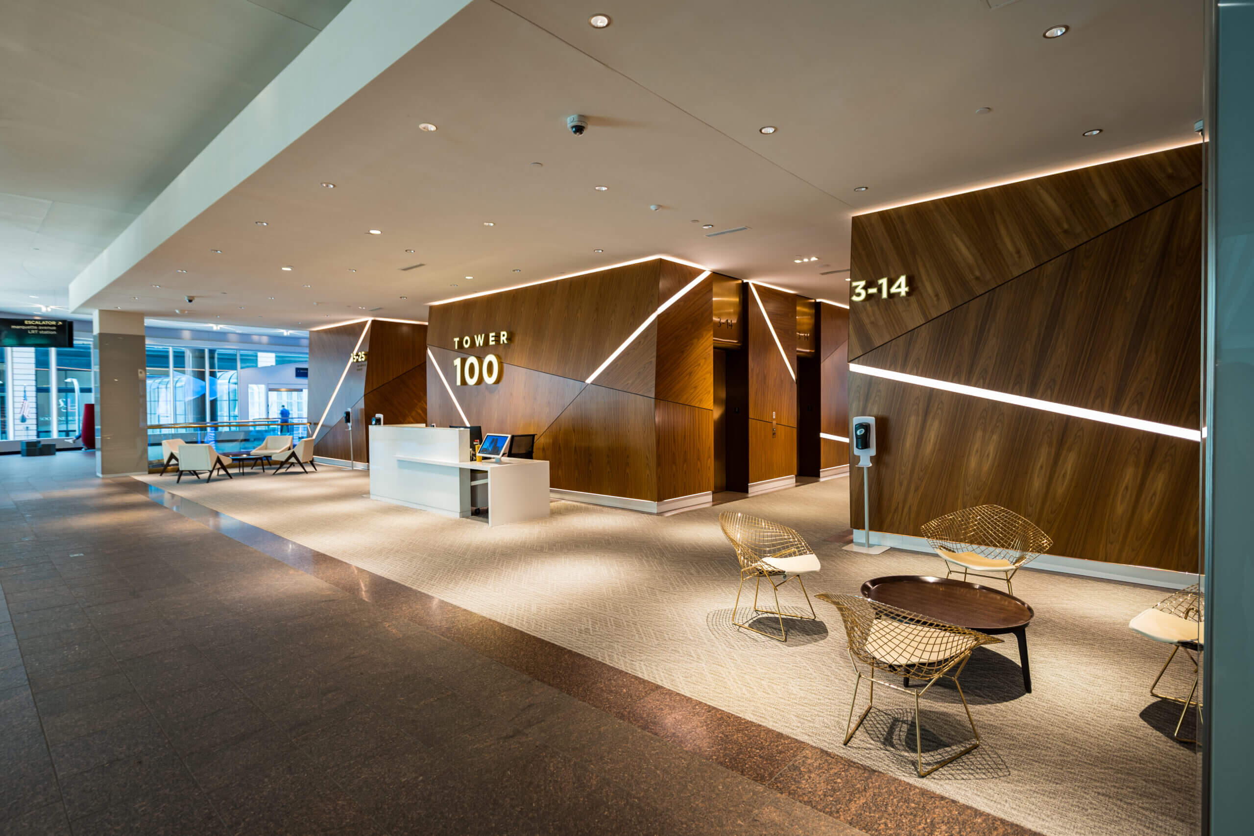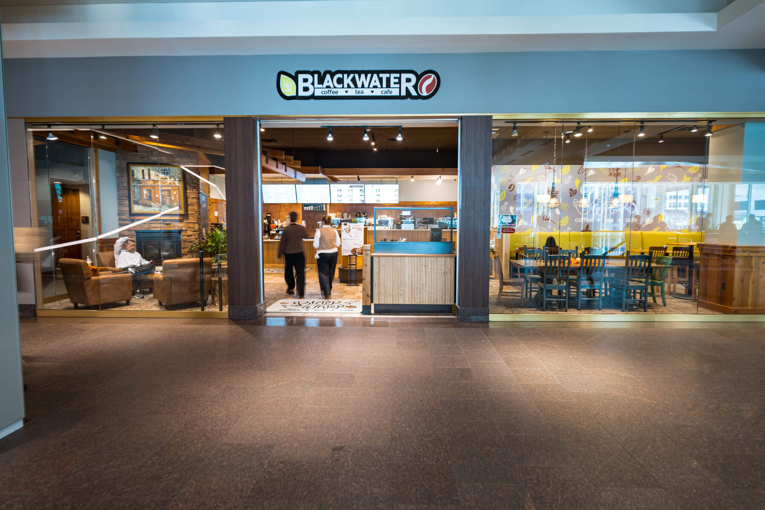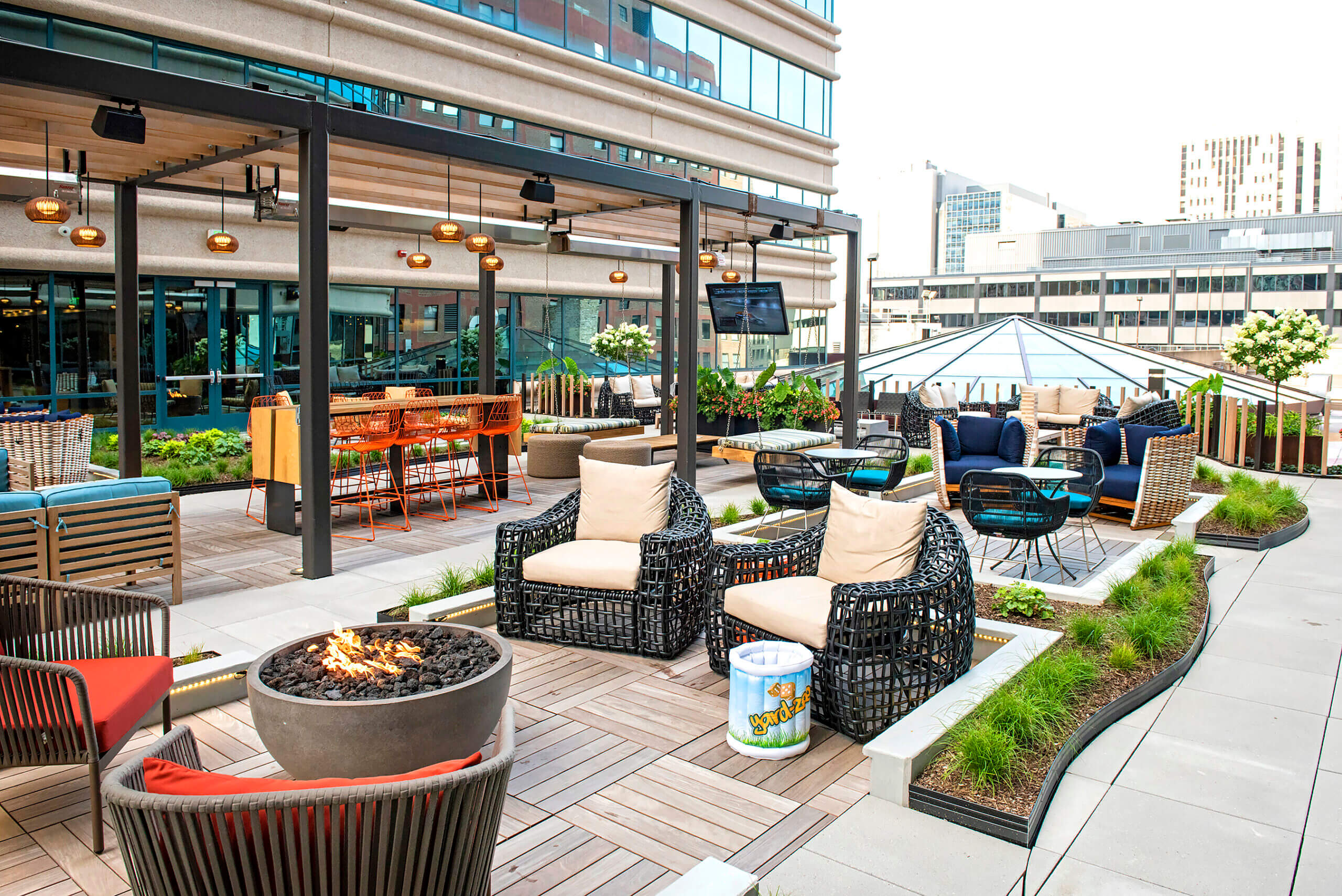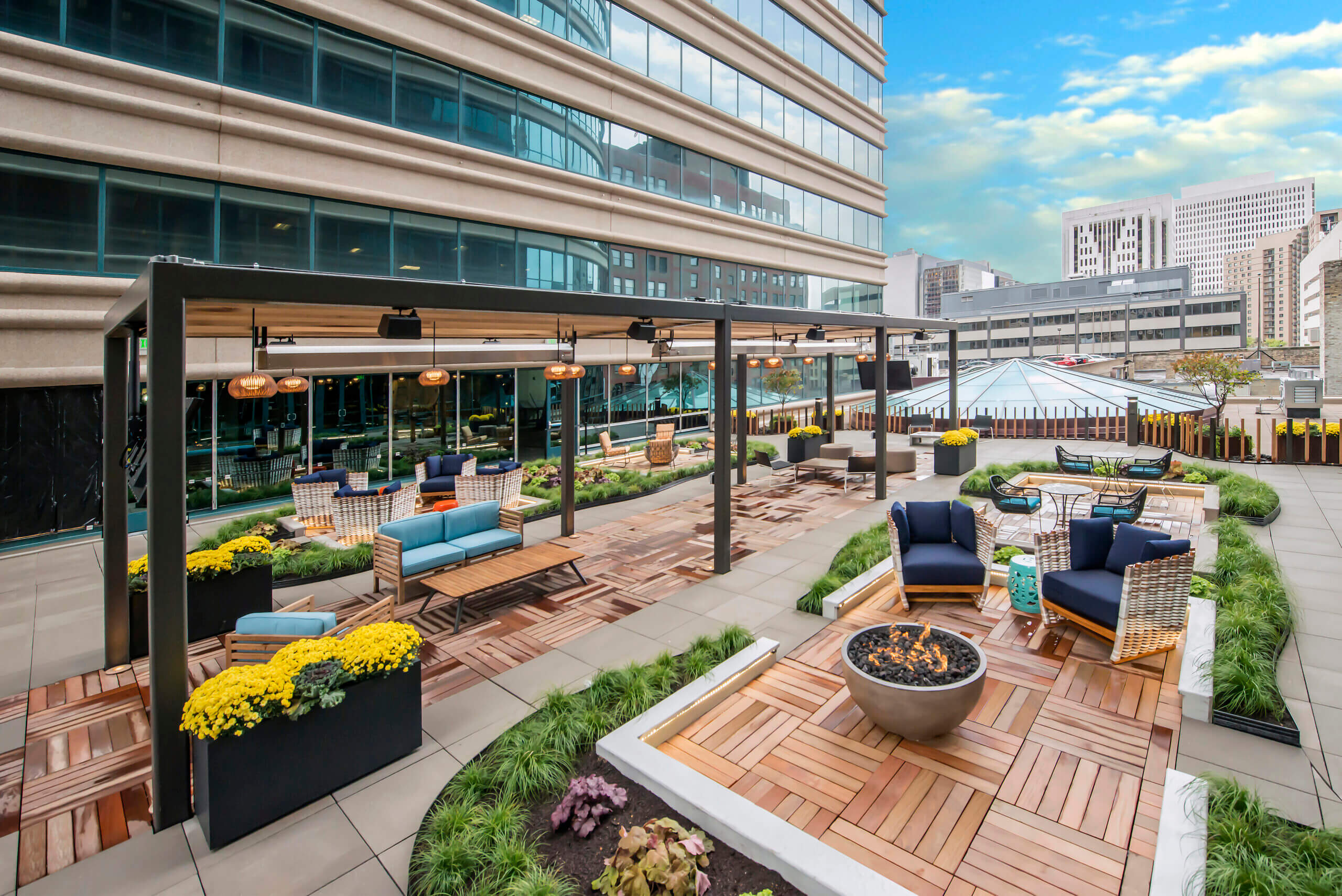 Connect lounge is a welcoming spot for employees looking for a change of scenery, featuring bar and lounge seating, private nooks, and cozy fireplaces.